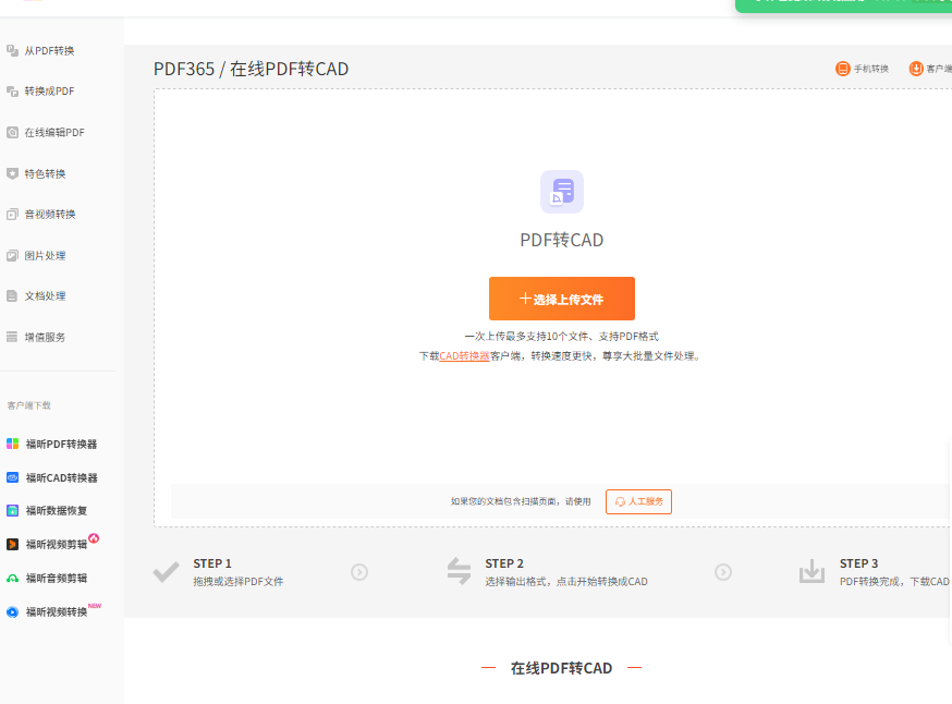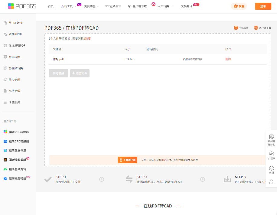 第一步:打開(kāi)福昕PDF365官網(wǎng),找到"PDF轉(zhuǎn)CAD"功能;