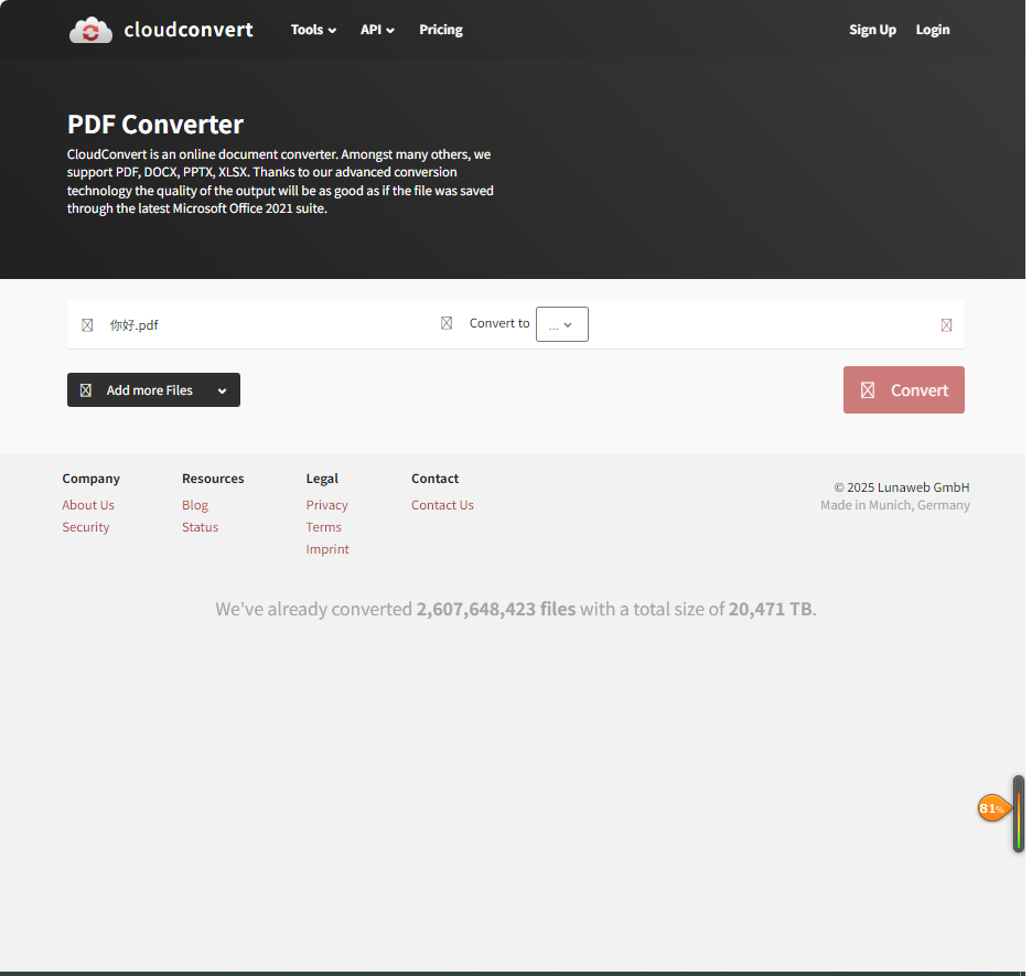 第一步:進(jìn)入CloudConvert頁(yè)面,直接點(diǎn)擊“Select File”,一次能選多個(gè)要轉(zhuǎn)換的PDF文件。?