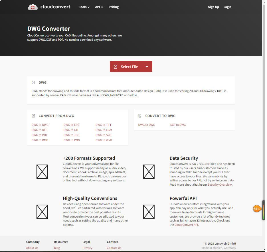 CloudConvert功能超全面,除了能把PDF轉(zhuǎn)成CAD,還能對(duì)PDF進(jìn)行編輯、壓縮、拆分合并等操作。它支持批量轉(zhuǎn)換PDF文件為CAD格式,大大提升工作效率。可以將PDF文件轉(zhuǎn)換成DWG或DXF等常用CAD文件格式,兼容性強(qiáng),不管你用啥CAD軟件基本都能打開(kāi)轉(zhuǎn)換后的文件。?